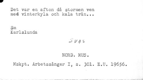 //// Det var en afton då stormen ven //// med vinterkyla och kala trän... //// Sm //// Karlslunda //// ^ b //// NORD. MUS. //// Mskpt. Arbetssånger I, s. 301. E.U. 19656. ////