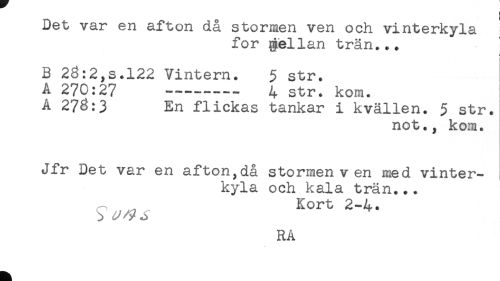 //// Det var en afton då stormen ven och vinterkyla ' //// for gellan trän... //// B 23:2,s.122 Vintern. $ str. //// A 270:27 --- 4 str. kom. //// A 273:3 En flickas tankar i kvällen. $ str. //// not., kom. //// Jfr Det var en afton,då stormen v en med vinter- //// kyla och kala trän... ////