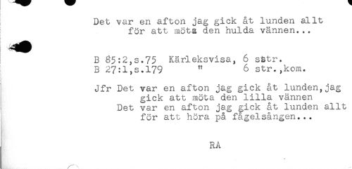 //// Det var en afton jag gick åt lunden allt //// för att möta den hulda vännen... //// t //// B g5:2,s+75 Kärleksvisa, 6 sätr. //// B 27:1,s.179 ^ 6 str.,kom. //// Jfr Det var en afton jag gick åt lunden,jag //// gick att möta den lilla vännen //// Det var en afton jag gick åt lunden allt //// för att höra på fågelsången... ////