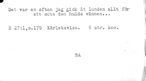 //// Det var en afton jag gick åt lunden allt för //// att möta den hulda vännen... //// i //// B 27:l,s.l79 Kärleksvisa. 6 str. kom. //// RA //// //// /