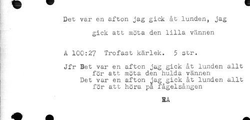 //// Det var en afton jag gick åt lunden, jag //// gick att möta den lilla vännen //// Rf* //// A 100:27 Trofast kärlek. 5 str. //// Jfr Bet var en afton jag gick åt lunden allt //// för att möta den hulda vännen //// Det var en afton Jag gick åt lunden allt //// för att höra pa fågelsången //// RÅ ////