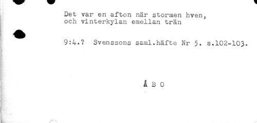 //// Det var en afton när stormen hven, //// och vinterkylan emellan trän //// 9:4.? Svenssons saml.häfte Nr 5. s.102-103. //// ÅBO //// ! ////