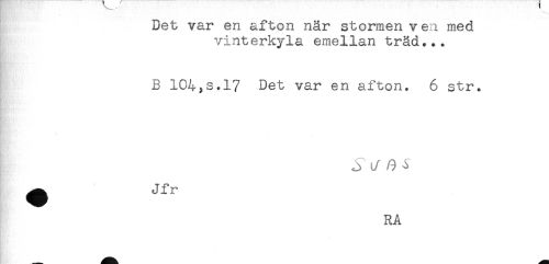 //// Det var en afton när stormen ven med //// vinterkyla emellan träd... //// B 104;s.17 Det var en afton. 6 str. //// [ ^ //// RA ////