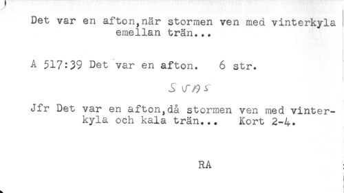 //// Det var en afton,när stormen ven med vinterkyla //// emellan trän... //// A 517:39 Det var en afton. 6 str. //// Jfr Det var en afton,då stormen ven med vinter- //// kyla och kala trän... Kort 2-4. //// RA //// * ////