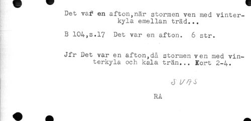 //// Det vaf en afton,när stormen ven med vinter- //// kyla emellan träd... //// B 104^s.17 Det var en afton. 6 str. //// + //// Jfr Det var en afton,då stormen ven med vin- //// terkyla och kela trän... Kort 2-4. //// RA //// !! ___ ////