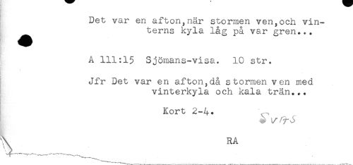 //// Det var en afton,när stormen ven,och vin- //// terns kyla låg på var gren... //// t //// A 111:1$ Sjömans-visa. 10 str. //// *! //// i //// Jfr Det var en afton,då stormen ven med //// vinterkyla och kala trän... //// Kort 2-4. //// \ RA ////