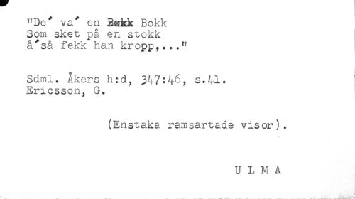 //// "De* va* en Bakk Bokk //// Som sket på en stokk //// å*så fekk han kropp...." //// Sdml. Åkers h:d, 347:46, s.41. //// Ericsson, G. //// (Enstaka ramsartade visor). //// U L M A //// .. . .. ..r..... .. ...... ^ ^ .. - ... . . ___ii.,.:, / y ////