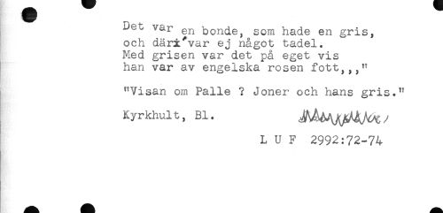 //// iJ ^^ bonde, som hade en gris, //// och däri^var ej något tadel. //// Med grisen var det på eget vis //// han var av engelska rosen fott,,," //// "Visan om Palle ? Joner och hans gris." //// Kyrkhult, Bl. //// L U F 2992:72-74 ////