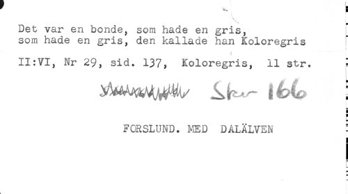 //// * . * //// . i //// t //// \ //// Det var en bonde, som hade en gris, //// som hade en gris, den kallade han Koloregris //// i //// II:VI, Nr 29, sid. 137, Koloregris, 11 str. : //// [ //// FORSLUND. MED DALÄLVEN ^ //// ! //// L //// r //// t ////