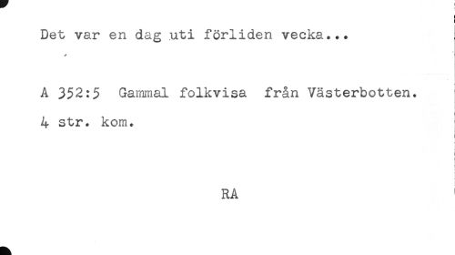 //// ! //// i //// Det var en dag uti förliden vecka... //// - //// < //// A 352:5 Gammal folkvisa från Västerbotten. //// t //// 4 str. kom. //// < //// i //// ! //// RA ////