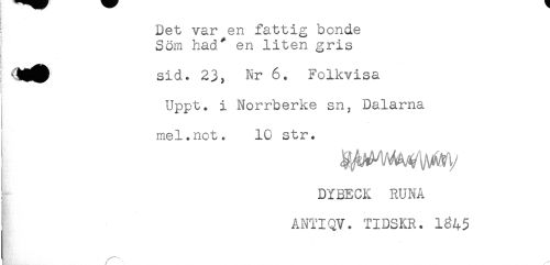 //// ! Det var en fattig bonde //// Söm had* en liten gris //// sid. 23> Nr 6. Folkvisa //// Uppt. i Norrberke sn^ Dalarna //// mel.not. 10 str. //// DYBECK RUNA //// ANTIQV. TIDSKR. 1645 ////