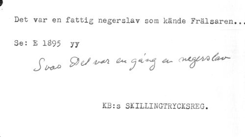 //// T //// Det var en fattig negerslav som kände Frälsaren... //// Se: E 1895 yy //// K3:s SKILLINGTRYCKSREG. ////