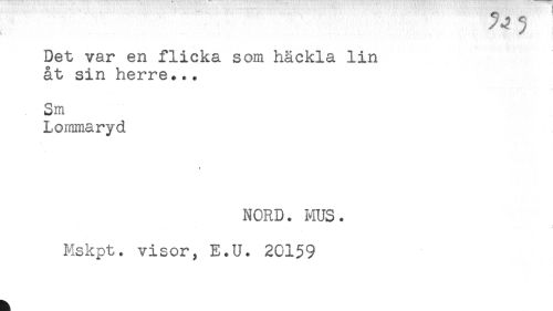 //// Det var en flicka som häckla lin //// åt sin herre..+ //// Sm //// Lommaryd //// ' //// NORD. MUS. //// Mskpt. visor, E.U. 20159 ////