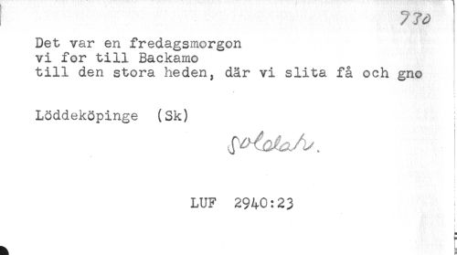 //// Det var en fredagsmorgon //// vi for till Backamo //// till den stora heden, där vi slita få och gno //// ! //// f //// Löddeköpinge (Sk) //// i //// < //// [ //// LUF 2940:23 ////