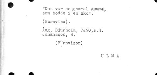 //// "Det var en gammal gumma, //// som bodde i en sko". //// (Barnvisa). //// Ang, Bjurholm, 7450,s.3* //// Johansson, H. //// (Barnvisor) //// U L M A ////