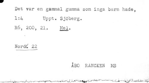 //// Det var en gammal gumma som inga barn hade, //// 1:4 Uppt. Sjöberg. //// R6, 200, 21. Mel. //// Nordd 22 //// ÅBO RANCKEN MS ////