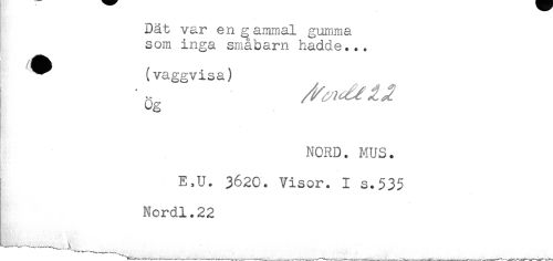 //// Dåt var eng ammal gumma //// som inga småbarn hadde... //// ^ (vaggvisa) //// NORD. MUS. //// E,U. 3620. Visor. I s.535 //// Nordl.22 ////