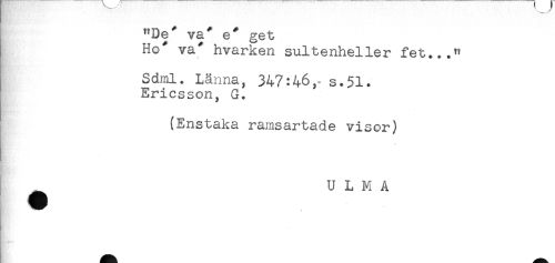 //// "De* va* e* get //// Ho* va* hvarken sultenheller fet..." //// Sdml. Länna, 347:46, s.$l. //// Ericsson, G. //// (Enstaka ramsartade visor) //// U L M A ////