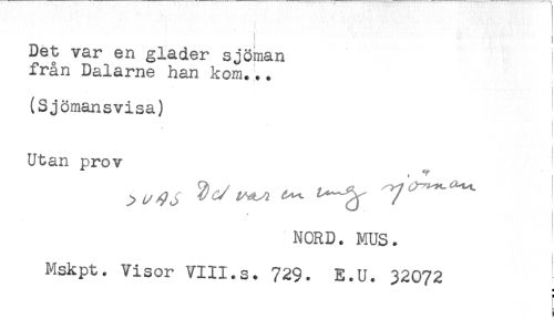 //// 4 //// : //// Det var en gläder sjöman //// från Dalarne han kom... //// (Sjömansvisa) //// Utan prov //// * //// NORD. MUS. //// Mskpt. Visor VIII.s. 729. E.U. 32072 //// H //// * ////