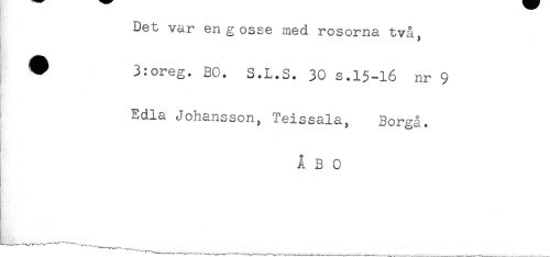 //// Det var en g osse med rosorna två //// jgR * //// # 3:oreg. BO. S.L.S. 30 s.15-16 nr 9 //// Edla Johansson, Teissala, Borgå. //// ÅBO //// y ////