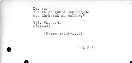 //// . ' ...... ' ' - . if //// Det var - ! //// "Dä va en gubbe han böggde //// ett körketak mä haller." //// Vgi. s.3* //// Hallander. //// (Nyare skämtvisor). //// ^ U L M A ////