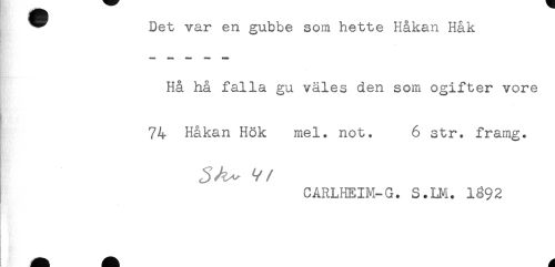 //// " Det var en gubbe som hette Håkan Håk //// Hå hå falla gu väles den som ogifter vore //// 74 Håkan Hök mel. not. 6 str. framg. //// JA- < //// //CARLHEIM-G. S.LM. 1392 ////
