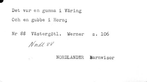 //// Det var en gumma i Väring //// Och en gubbe i Horn; //// Nr Västergötl. Werner s. 106 //// ? ' ^ //// NORDLANDER Barnvisor ////