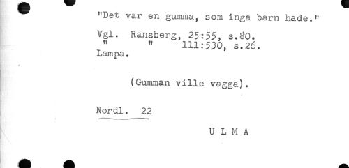 //// '-Det var en gumma, som inga barn hade." //// Vgl. Ransberg, 25:55, s.30. //// " 111:530, s.26. //// Lampa. //// (Gumman ville vagga). //// .. //// Nordl. 22 //// U L M A ////