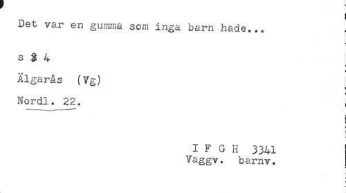 //// ) //// Det var en gumma som inga barn hade... //// - //// s g 4 ' //// - //// i //// Älgarås (Vg) //// ! //// Nordl. 22. i //// i //// S //// - //// I F G H 3341 //// Vaggv. barnv. //// < ! ////