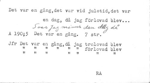 //// Det var en gång,det var vid juletid,det var //// en dag, då jag förlovad blev... //// ^^^ //// A 190;5 Det var en gång. 7 str. //// t //// Jfr Det var en gång,då jag trolovad blev //// " " " " " " förlovad blev //// " " !! !! !! !! H //// ) //// RA ////
