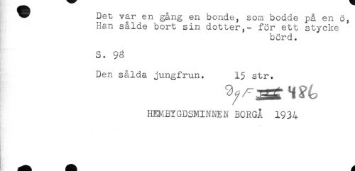 //// W Det var en gång en bonde, som bodde på en ö, //// Han sålde bort sin dotter,- för ett stycke //// börd. //// S. 93 //// Den sålda jungfrun. 15 str. //// ^ ssr i % //// HEMBYGDSMINNEN BORGÅ 1934 ////