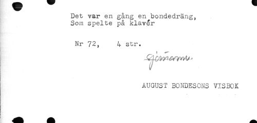//// Det var en gång en bondedräng, //// Som spelte på klaver //// Nr 72, 4 str. //// t //// AUGUST BONDESONS VISBOK //// T . ... //// 1 HH ////
