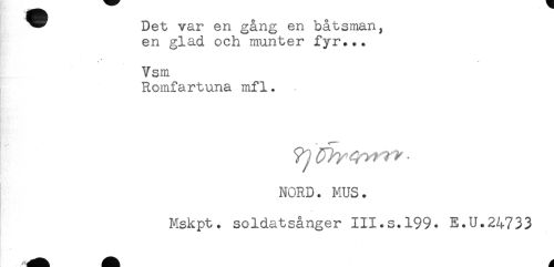 //// ^^ Det var en gång en båtsman, //// en glad och munter fyr... //// * //// Vsm //// Romfartuna mf 1. //// NORD. MUS. //// Mskpt. soldatsånger III.s.199. E.U.24733 ////