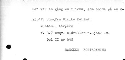 //// Det var en gång en flicka, som bodde på en ö- //// .sj.af. jungfru Ulrika Dahlman //// Mustas., Karperö //// W. 3*7 omqv. o.driller n.Sjöb? -m. //// Del II nr 69^ //// ^ RANCKEN FÖRTECKNING //// . ////