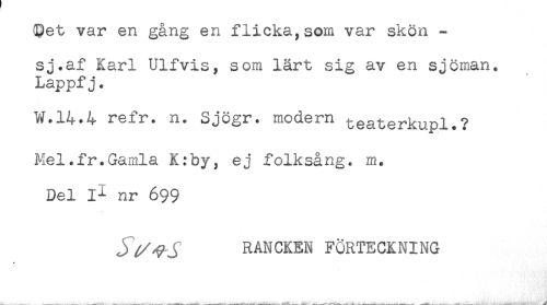 //// (Pet var en gång en flicka, som var skön - //// sj.af Karl Ulfvis, som lärt sig av en sjöman. //// Lappfj. //// W.14.4 refr. n* Sjögr. modern teaterkupl.? //// Mel.fr.Gamla K:by, ej folksång, m. //// Del il nr 699 //// J ^VJ RANCKEN FÖRTECKNING //// * ////
