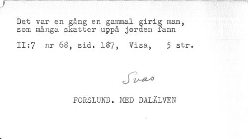 //// Det var en gång en gammal girig man, //// som många skatter uppå jorden fann //// 11:7 nr 68, sid. 187, Visa, 5 str. //// FORSLUND. MED DALÄLVEN ////