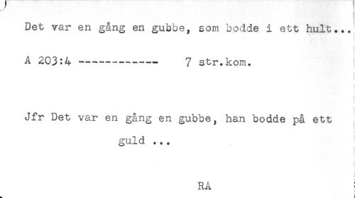 //// Det var en gång en gubbe, som bodde i ett hult... //// A 203:4 ----—— 7 str.kom. } //// Jfr Det var en gång en gubbe, han bodde på ett , //// t //// guld ... //// RÅ ! ////