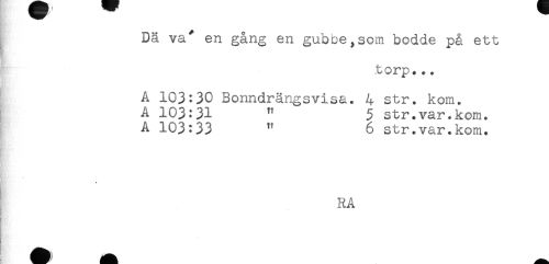 //// Dä va* en gång en gubbe,som bodde på ett //// torp... //// A 103:30 Bonndrängsvisa. 4 str. kom. //// A 103:31 " 5 str.var.kom. //// A 103:33 " 6 str.var.kom. //// K; //// * //// RA ////