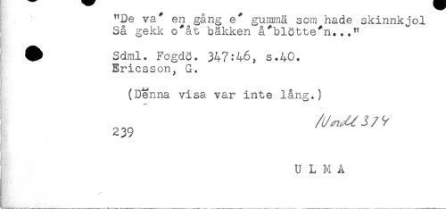 //// "De va* en gång e* gumma som hade skinnkjol //// Så gekk o*åt bäkken å*blötte*n..." //// ^ Sdml. Fogdö. 347:46, s-40. //// Ericsson, G. //// j (Denna visa var inte lång.) //// t! //// it //// ^ / ^ //// 239 //// ! //// U L M A //// < ////