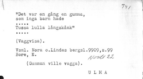 //// "Det var en gång en gumma, //// som inga barn hade //// ***** //// Tussa lulla långskånk" //// ***** //// (Vaggvisa). //// Vsml. Nora o.Lindes bergsl.9909^s.99 //// ^^ ' K' ^^ ^ //// (Gumman ville vagga). //// U L M A ////