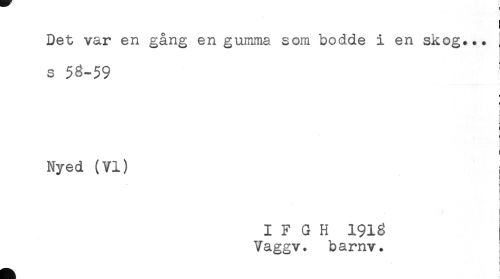 //// ! //// ! //// Det var en gång en gumma som bodde i en skog... //// s 58-59 //// i //// i- //// i //// Nyed (VI) I //// I F G H 1918 //// Vaggv. barnv. ////