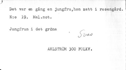 //// Det var en gång en jungfru,hon satt i rosengård. //// N:o 19. Mel.not. //// Jungfrun i det gröna //// i //// t //// AHLSTRÖM 300 FOLKV. //// i //// t ////