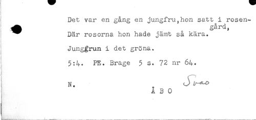 //// t Det var en gång en jungfru,hon satt^i rosen- //// ! ^^ Där rosorna hon hade jämt så kära. //// Junggrun i det gröna. //// I 5:4. PE. Brage 5 s. 72 nr 64. //// N. . ^ //// ' ÅBO ////