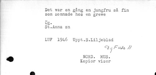 //// Det var en gång en jungfru så fin //// som somnade hos en greve //// Og. //// St.Anna sn //// LUF 1946 Uppt.S.Liljeblad //// ^ NORD. MUS. //// ^^ Kopior visor ////
