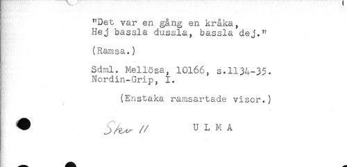 //// "Det var en gång en kråka, //// Hej bassla dussla, bassla dej." //// (Ramsa.) //// Sdml. Mellösa, 10166, s.1134-35. //// Nordin-Grip, 1. //// (Enstaka ramsartade visor.) //// ^ 3 // u L M A ////