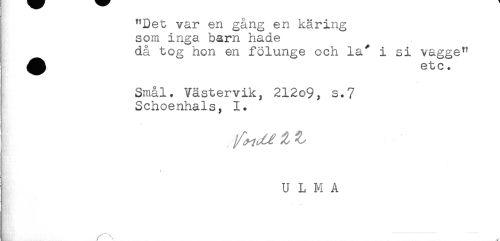 //// "Det var en gäng en käring //// som inga barn hade //// : då tog hon en fölunge och la* i si vagge" //// ^ etc. //// t! //// - //// ! Smål. Västervik, 212o9, s.7 //// Schoenhals, 1. //// ^ .., , Z Z t //// Hr. //// t //// U L M A //// K ////