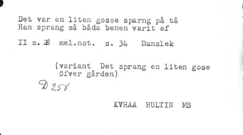 //// Det var en liten gosse sparng på tå //// Han sprang så båda benen varit af ! //// ! //// r //// II s. 33 mel.not. s. 34 Danslek //// ! //// (variant Det sprang en liten gose i //// öfver gården) //// KVHAA HULTIN MS //// t //// t. ////