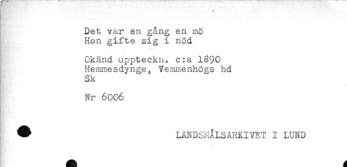 //// Det var en gång en mö //// Hon gifte sig i nöd //// + //// Okänd uppteckn. c:a 1^90 //// Hemmesdynge, Vemmenhögs hd //// Sk //// \ //// Nr 6006 //// ^ LANDSMÅLSARKIVET I LUND ////