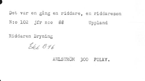 //// Det var en gång en riddare, en riddareson //// N:o 102 jfr n:o Uppland //// Riddaren Bryning //// AHLSTRÖM 300 FOLKV. ////
