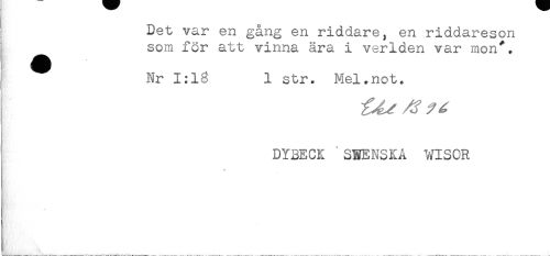 //// Det var en gång en riddare, en riddareson //// som för att vinna ära i verlden var mon'. //// ^ Nr 1:13 1 str. Mel.not. //// DYBECK 'SEENSKA WISOR ////